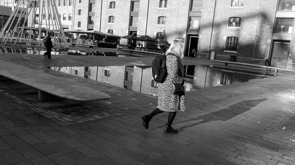 Apologies to the artist Liliane Lijn but I was more interested in how the late morning light was just pushing into the darker corners as well as creating a framed shadow on the buildings in the background. I’d anticipated the woman in the faux leopard skin coat walking on by to fill the foreground frame here as well as provide a nice long shadow but am still not sure if it had been better to have waited a second or two sooner or later, so that she does not cut off the angle of the water. On the other hand, I’m entirely happy with her placement in the frame. Finally, the mid-ground pedestrian walking parallel seemed like a good inclusion as balance but now it just irks. Still, I had to have both people or none as we cannot direct everything about our photos, especially those on the street!