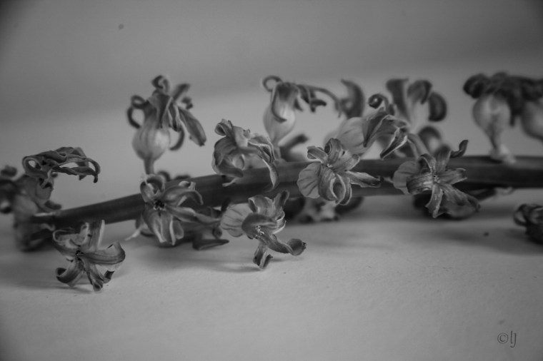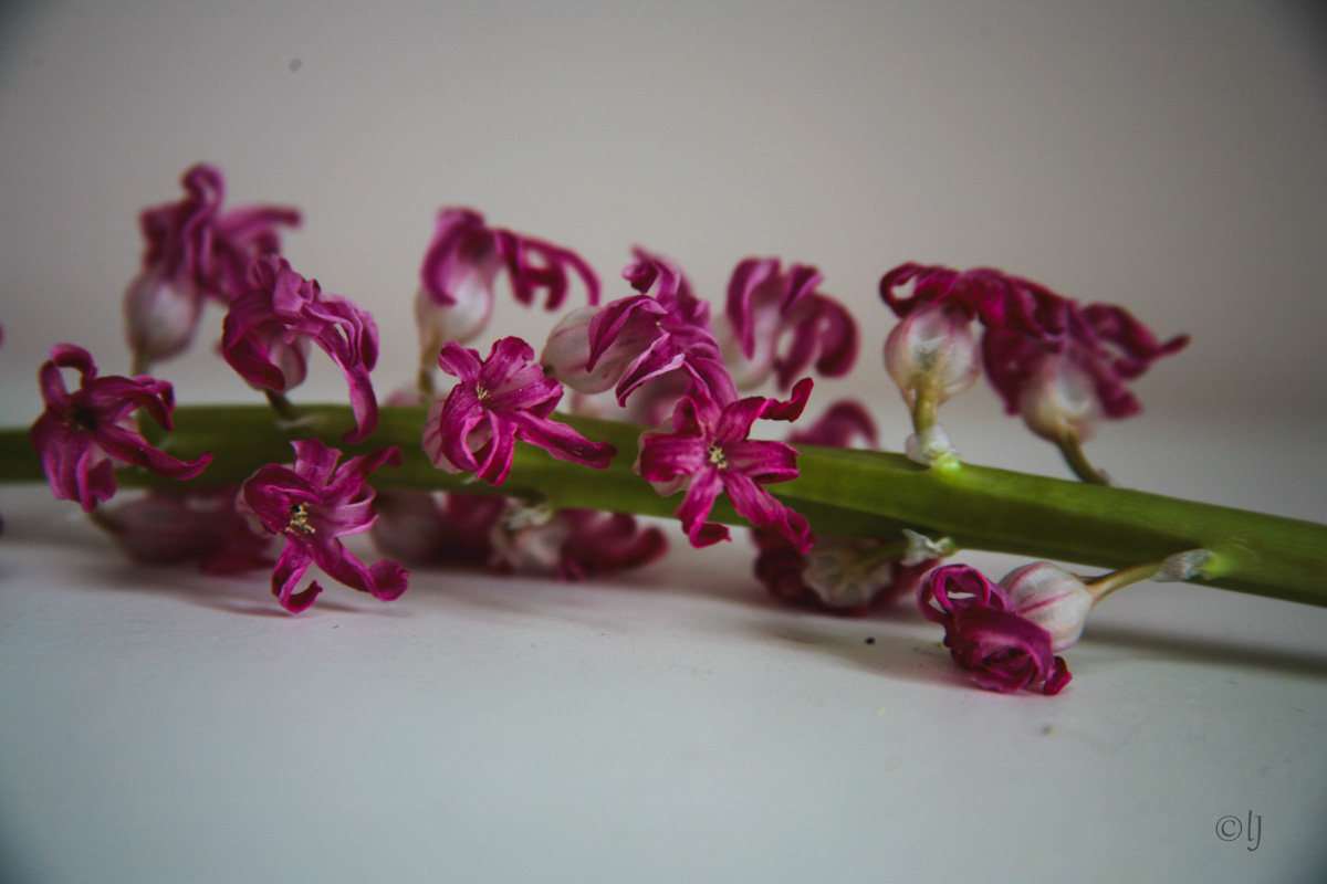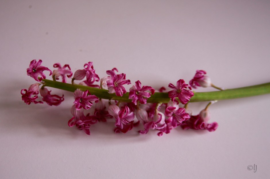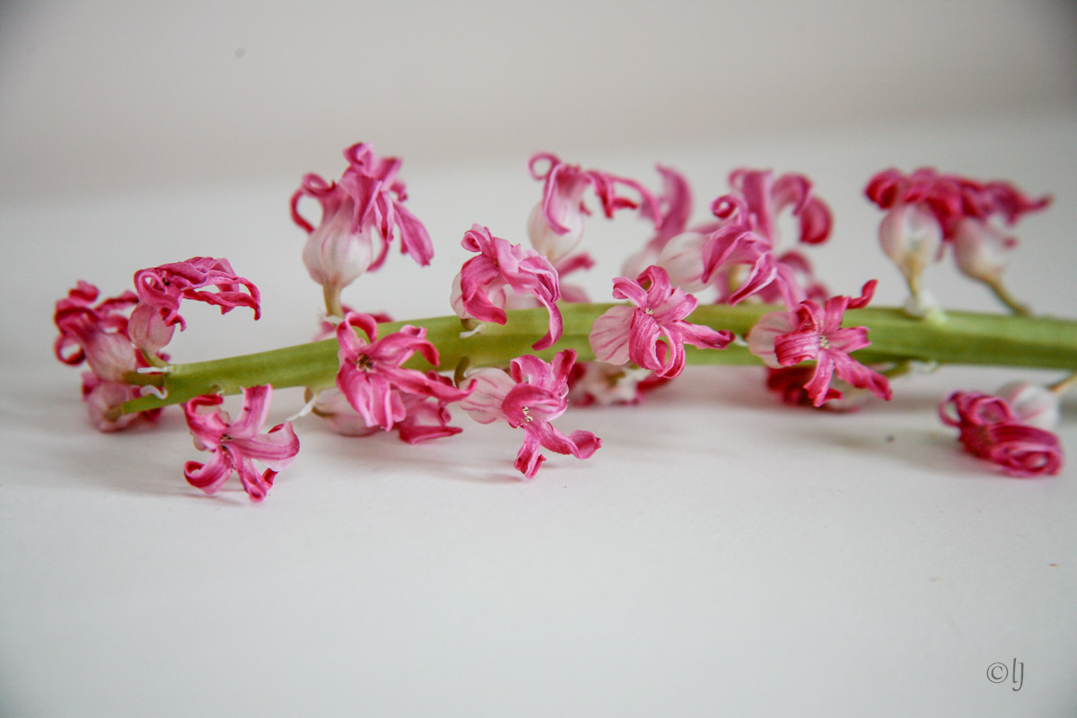 I was just about to discard this stem of an aged pink hyacinth when the swelling shape of the spent flowers caught my attention. Once blooms are past their peak they develop that wabi sabi allure of attractive imperfection and also in becoming less organic offer up a more artistic interpretation to our eye .