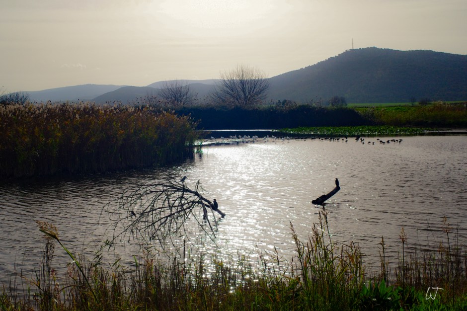 Broad-headed kingfishers minnow-hunting from willow stems on meandering