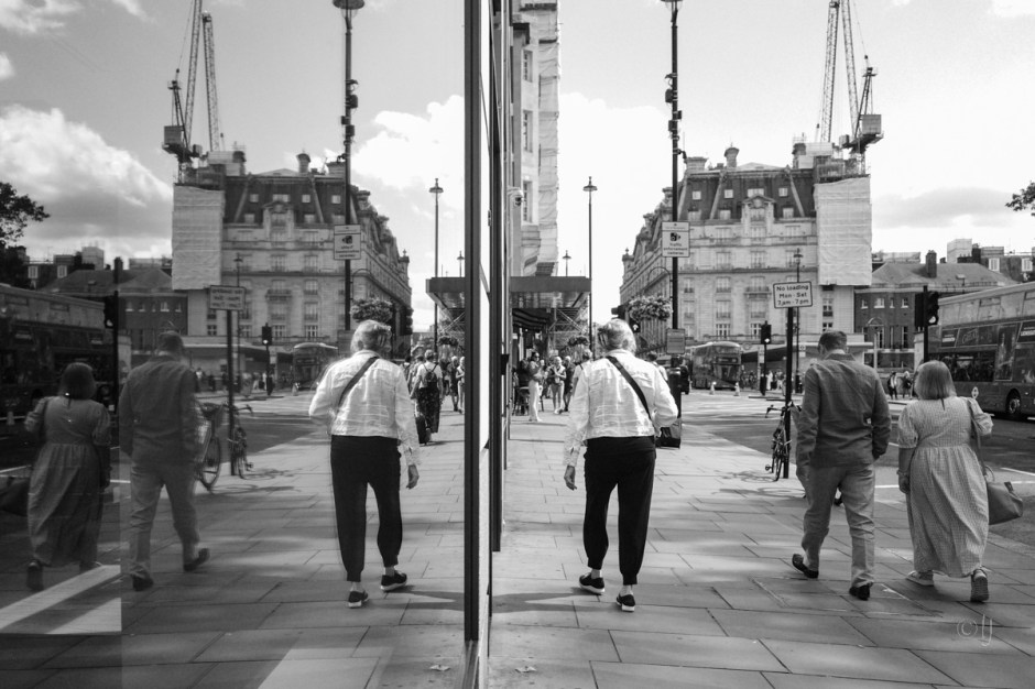 Walking down London’s Piccadilly towards ‘the circus’ and in the shop window a chance to capture another double image unified in black and white