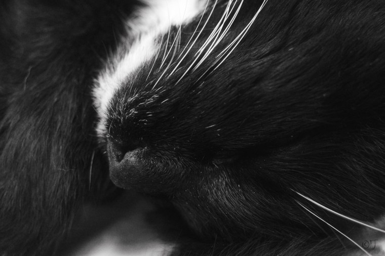 In daylight, it is evident that Moog is not a completely black and white cat, but tends towards some ginger. Even so monochrome suits her.