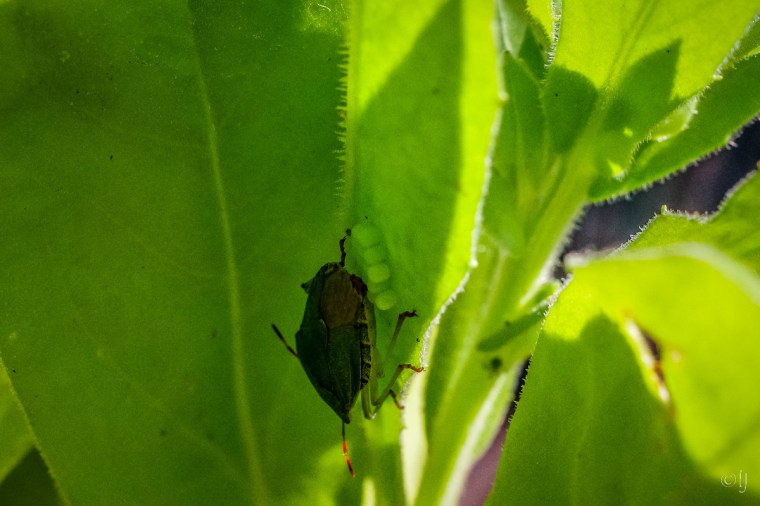 I spotted this Shieldbug laying her eggs on a potted Calendula. Some days later they hatched – the leaf taken off for the camera but put back in the pot for the young to grow up. Now that is organic gardening with a touch of Jainism! There are 10 native Shieldbugs in the UK and the red-legged forest Shieldbug even predates caterpillars and other insects. Here’s hoping these are those!